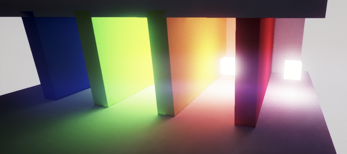 Below I made a simple scene and did a quick fly thru, realtime GI for the sun obviously and baked area lights in places.